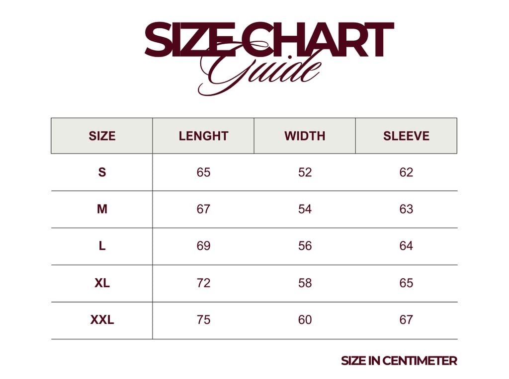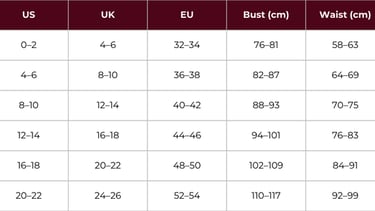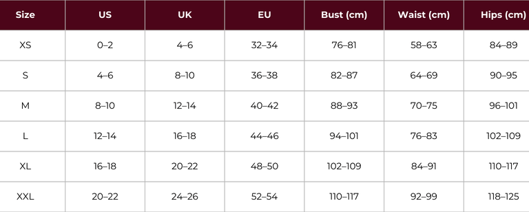 • Size charts may vary slightly depending on the style and fabric.